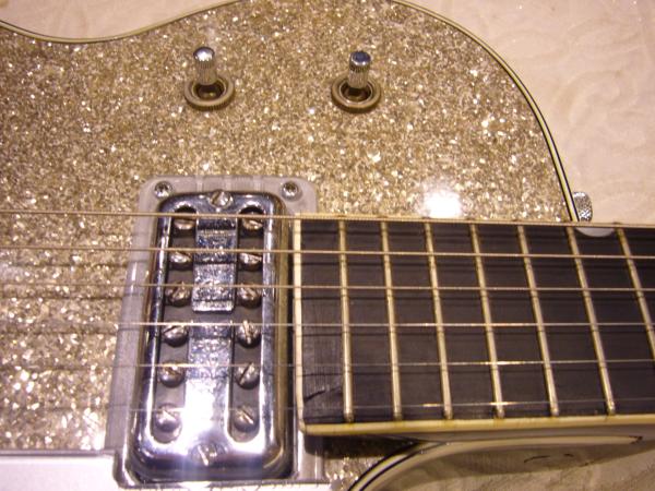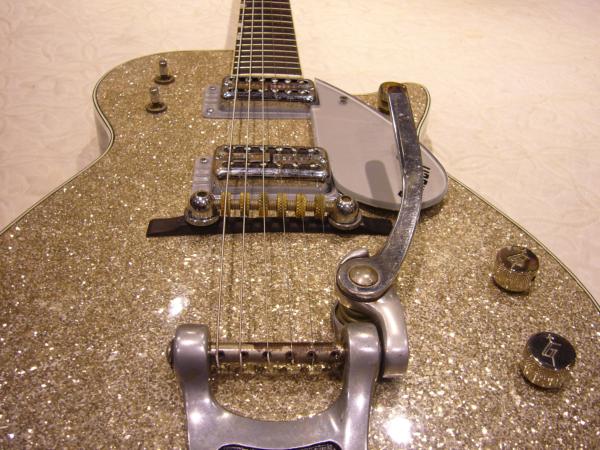 グレッチ社を代表するセミ・ホロウ構造を持つ[DUO-JET]シリーズは、1953年の中旬にブラック・フィニッシュのデュオ・ジェットが発売されて以来、徐々にマイナー・チェンジが行なわれていた。そうした中で、トップにシルバー・スパークルをあしらったモデルとして、シルバー・ジェットが1955年にモデル・ネーム[6129]として発売された。実はシルバー以外にもさまざまなスパークル・カラーが用意されており、ゴールドやシャンパン、バーガンディー、タンジェリンなど、その種類は20近くあったという。これはグレッチ社が製作していたドラム用の装飾材を流用していたからで、1962年までスパークル・フィニッシュは製造されていた。