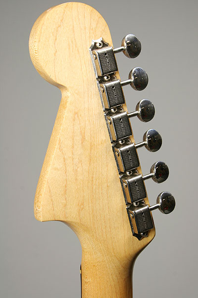 今回はこのジャガーについて紹介しよう。写真のギターは1963年製で、指板はラウンド・ボード、クレイ・ドット・ポジション・マークという仕様を持つ。1962年に登場した時はスラブ・ボードで、ジャガーのロゴは最初からトランジション・ロゴが採用されていた。ボディは“オフ・セット・ウェスト”と呼ばれる左右のくびれ位置が非対称となったシェイプで、立って持った時にくびれたボディのラインが垂直に重なる、とてもバランスの良いシェイプである。