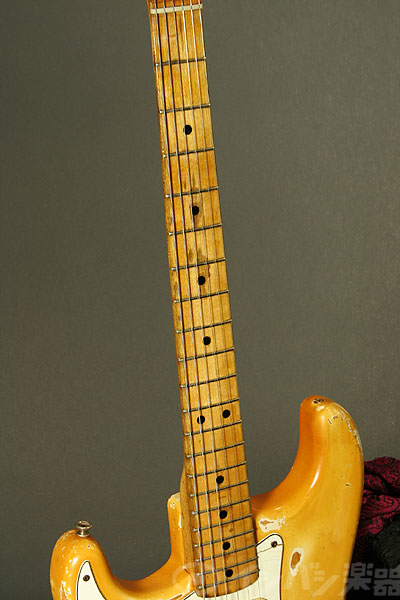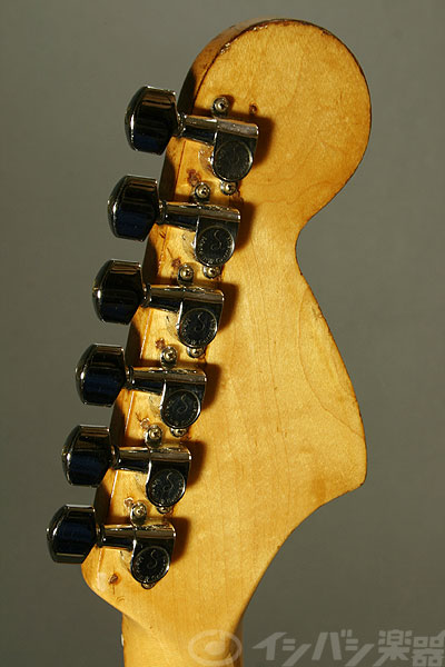 今回は大変珍しい70年代の左用ストラトキャスターを紹介。元のカラーはホワイトだが色焼けによって黄ばんでいる。ところどころ擦り減った部分からオリジナル・カラーのホワイトが見え、その下にアンダーコートのクリア(ポリ塗装)が顔を覗かせている。さらに塗装が剥げた箇所にはボディの地肌が見え、使用材がアルダーということが確認できる。ヘッド表面がネックの他の部分より焼けやすいのは、他の部分がポリ塗装なのに対し、ヘッド面だけ最終段階でラッカー吹いているからで、これは70年代の特徴となっている。
