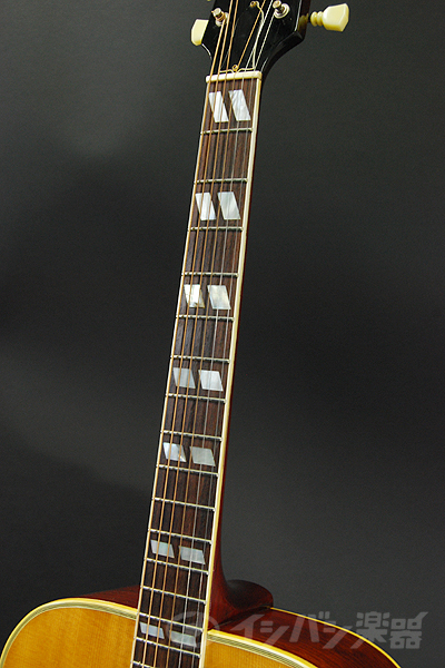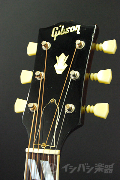 ヘッド中央部はクラウン・インレイで飾られ、指板インレイはパラレログラム、ロゴはゴシック・タイプ、ペグにはキーストーン・タイプのクルーソンが使用されるなど、ギブソンらしい派手なルックスで仕上げられております。 この時期のものでクルーソン・ペグの2コブのツマミを1コブに削り落としているものも見かけます。これはコブがヘッドにぶつかることを考慮し、わざと2コブのものを1コブにしていると言われています。