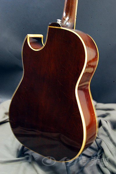 CF-100Eはギブソン・フラット・トップ・アコギの中で初めてピックアップを搭載したモデルで、1951~1958年の間で生産されました。最近ではリイシュー・モデルも発売され、人気があります。ちなみにピックアップ非搭載のCF-100が1950年に先行して発売されていました。ピックアップ付きモデルに対しては、型番末尾にエレクトリックを意味する“E”が付きます。ボディはLG-2と同サイズで、先が尖ったフローレンタイン・カッタウェイ仕様となっており、ピックガードはこのシェイプに合わせてデザインされています。またピックアップが搭載されたことにより、サウンド・ホールの位置がブリッジ寄りに移動しているのも特徴。とてもカッコいいルックスで、シンガーソングライターを中心に人気の高いモデルです。