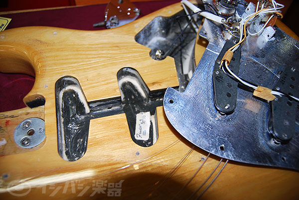 おそらくこれは白のパーツが残っていて、使い切りたかったからでしょう。こうしたことはフェンダー社ではよくあることで、テレキャスターが発売された1952年当時も“ノーキャスター”のロゴ・シールが余っていたことで、テレキャスターの名前が正式に決まっていたにもかかわらず、しばらく“ノーキャスター”のロゴ・シールが使用されていたそうです。