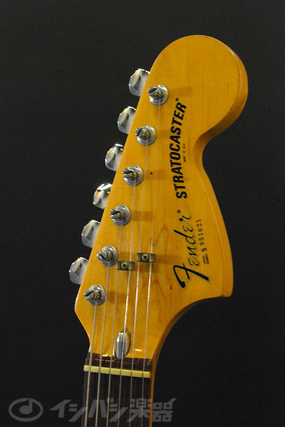 今回は1980年製フェンダー・ストラトキャスターを紹介します。1979?81年の間、ストラトキャスターの生産本数が最も多い時期と言われており、各パーツが増産された結果、ストック数が管理できず、ボディよりネックの方が多く作られてしまうというトラブルも発生したようです。この時期のストラトキャスターはどのような作りであったかを各パーツごとに見ていきたいと思います。 まずヘッドは1965年より続いているラージ・ヘッドでCBS時代の象徴とも言えるデザインですが、ヘッド・ロゴは時代により変更されています。1976年には、それまでネック・プレート裏に刻印されていたシリアル・ナンバーがヘッド・ロゴ下に移り、“ヘッド・シリアル”と呼ばれる時代に入ります。