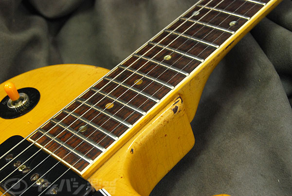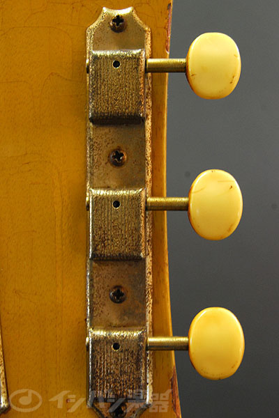 ヘッド中央には“Les Paul TV MODEL”と塗装の上からシルク・スクリーンで転写されていますが、この個体には擦られた跡があり、文字が薄く残っている状態。塗装の上に施されているため、指で擦るだけでも文字は消えてしまうほどです。