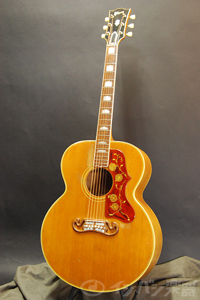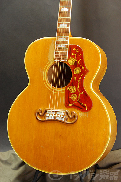 J-200は1938年に当時としては破格の200ドルの売値で発売。40年代までは[スーパー・ジャンボ]というモデル名を名乗り、その後は[スーパー・ジャンボ200]、[SJ-200]と機種名は変更されていきました。そして1947年には本体のラベルには[SJ-200]と記されたものの、カタログ上では[J-200]と表記されました。ちなみにラベル上で[SJ-200]と記されたのは50年代初期までと言われていますので、今回の1955年製はラベルに[J-200]と書かれた初期ものということになります。