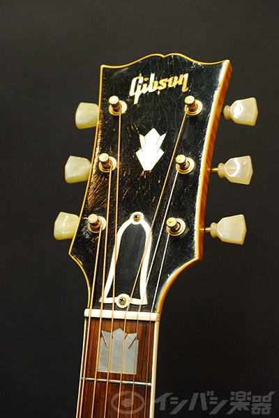 特に人気が高いのは、やはり1950年代で、力強い鳴りが特徴です。60年代に入るとチューン・オー・マティック・ブリッジが搭載され、より歯切れの良いジャッキッとしたサウンドになります。今回の1955年製はブリッジが初期タイプのムスタッシュ(髭)ブリッジで、両サイドがくり抜かれています。これに対し60年代のチューン・オー・マティック・ブリッジを搭載していたタイプは、両側がくり抜かれておらず、その箇所にインレイが施されていました。 ペグはクルーソンで、ノー・ライン、シングル・リング、シャフト・ホールありという仕様を持つ、1953?56年頃のスタイルで、59年以降から搭載されたグローバー製ロトマティックに比べて軽量なため、ギターの鳴りにも影響を与えています。
