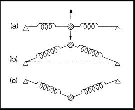 その質量の振動は単一共振系と同じで、現われる共振動数はただ一つである。 即ち質量を持ち上げて離すと一つの規則的な振動を行い、 その振動数は次のように与えられる。