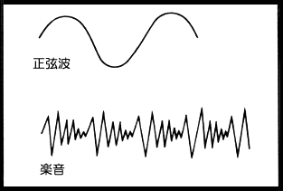それは連続体と見なし、弦そのものと考える事ができる。 このように弦の振動は、多くの振動子が結合している 連成振動と考える事ができ、 その結果弦の振動には 一つの振動数のみを有する音は一般に純音、正弦波と呼ばれる。 →右の図に示した波形は複雑であるが周期がある。 このような周期的な波は多くのsin波、cos波に分解されるが、 これが一般にフーリエ級数と言われるものである。 つまり逆に言うならば右の図→の波形は簡単な正弦波を 組み合わせる事によって作られている事である。 |