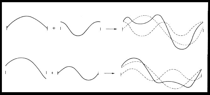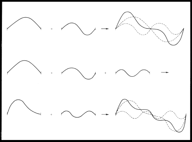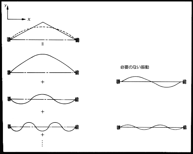 弦振動は、多くのモードの合成であり、また2つの固定点内部における定在波である事、