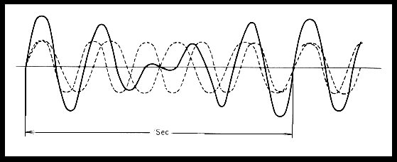 | 上の図↑を見ると、2つまたは3つ以上の正弦波を加えると 波形は異なっている事がわかる。 加え合わせる波が常に周期的であれば、 結果として生じる波も明らかに周期的であるし、 もし加え合わせる波が異なったとすると合成された波は↓下の図のように明らかに違う。 |