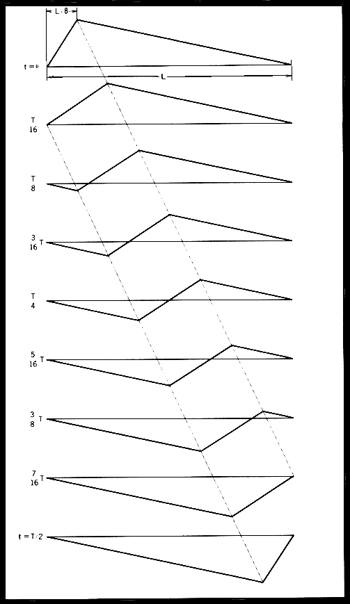 即ち↑上の式のように表わされる。 例えばL/8の位置を引張り、はなした場合の経過は左の図←のように通りである。 この図では半周期分をT/16ごとに記しているが、 全体としてわかいやすく示したのが下の図↓である。 このように弦の振動は最初の形を、一定の周期をもって繰り返す。 一般の水の波紋や、音波などの波は、障害物となる何かが存在するならば必ず進行波と、 それと反対方向に進む反射波が存在する。弦振動もまたそうである。 両端の固定された弦ではその固定点でそれぞれの波が反射し、 両固定点の内部で2つの波が合成されたものが存在する。 下の図↓はそれらの関係を示している。 2つの波は互いに2L/Tの速度で逆向きに進む。