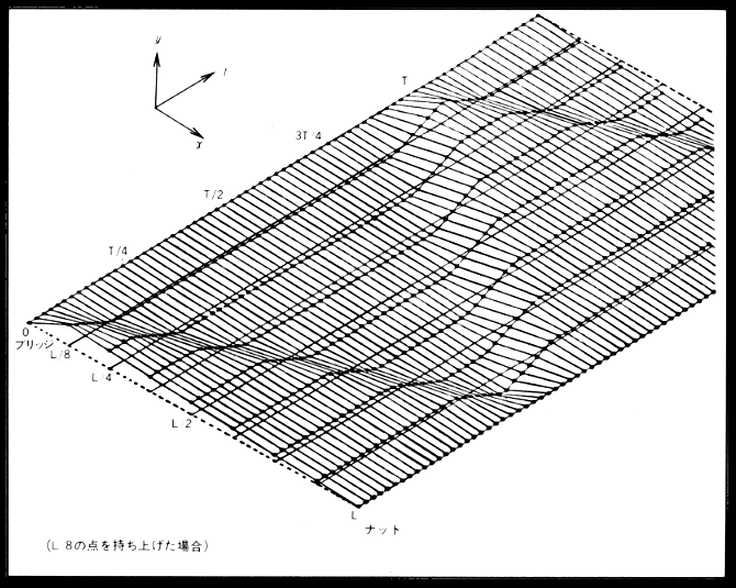 横振動は、弦の質量と張力により生じ、縦振動は弦自体が伸び縮みするもので、 弦の素材に関係する。実際に弦を弾くと、この両者が組合わされた弦を生じる。 しかし縦振動の成分は非常にわずかであり、横振動の方が重要な役割を果している。 そこで弦振動に関しては横振動のみを扱うものとし、 弦振動とは横振動のことを意味しているものとする。 さらに弦の材質は全体が均一で、張力も一定であり、 弦自身は完全に柔軟性を有するものとする。 以上のような仮定に基づくと、弦振動を表わす運動方程式は 数学的に編微分方程式の境界位置問題の形をとる。 簡単に説明すると、弦は連続体でありそれぞれの部分が、 位置と時間に依存して運動を行ない、それらが、弦の境界即ち、 固定点の条件によって決定されるということである。 |