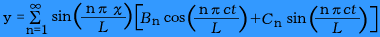 | 即ち上の図↑のようにL/2を引張った場合その形は、 奇数次の高調波により形造られる。 つまりここでは中心について対称であり、 中心について対称でない偶数次の高調波は現われない。 これらの事を数式で表わすと下のように与えられる。 |