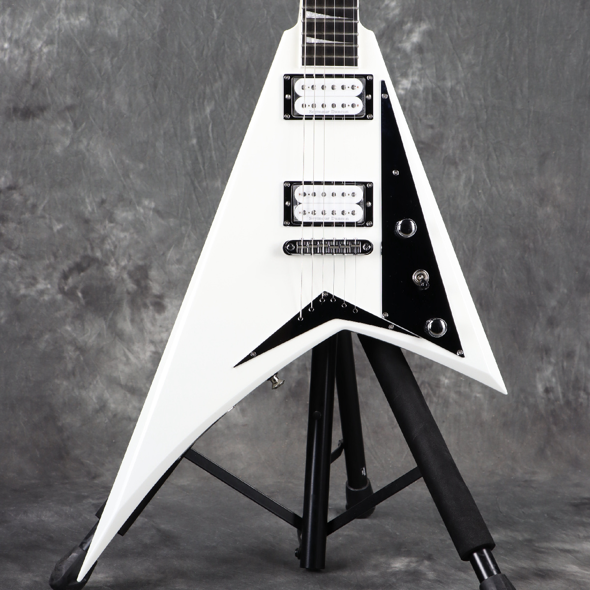 MJ Series Rhoads RRTは、鋭角なホワイトヘッドストック、クロムピックガード、クロムハードウェアを備えたSnow Whiteフィニッシュのクラシックで大胆なスタイリングが魅力です。