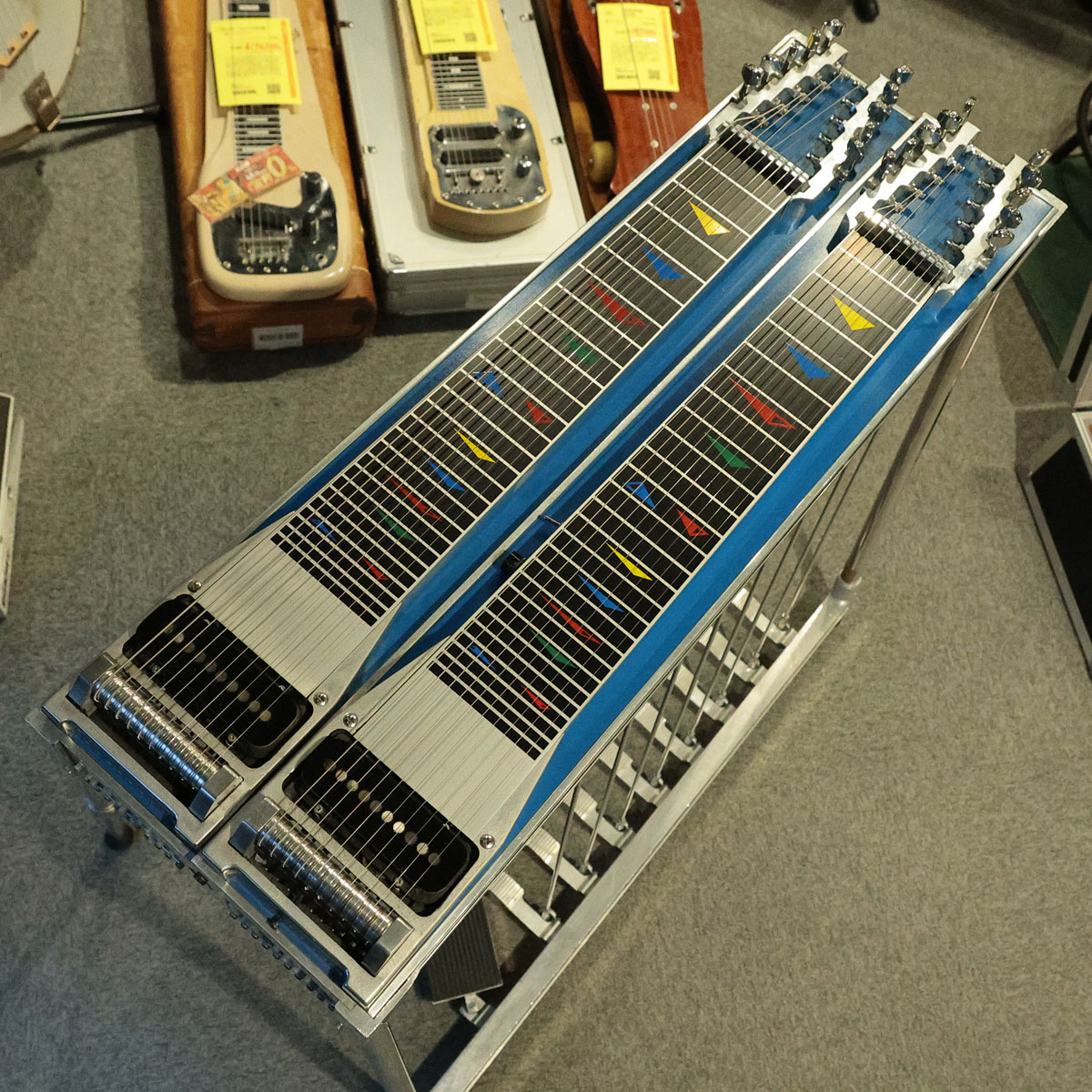 日本が世界に誇るファゼイ・ペダル・スティール・ギターのエクセル・モデルです。10弦ダブル・ネック(E9th+C6thチューニング)で、8フロア・ペダル、7ニー・レバーとフル装備と言える仕様。E9thのネックの5弦にはスプリット・チューニングのスクリューが付いています。近年の製品はキーレス構造ですが、当個体はペグがついた時代のものです。2000年位の製品と思われます。明るいブルー(ターコイズ・ブルー?)のマイカ仕上げですが、ボディの上部、前後の板ともに木が使用されています。両ネックともにピックアップはEmmonsのものに交換されています。