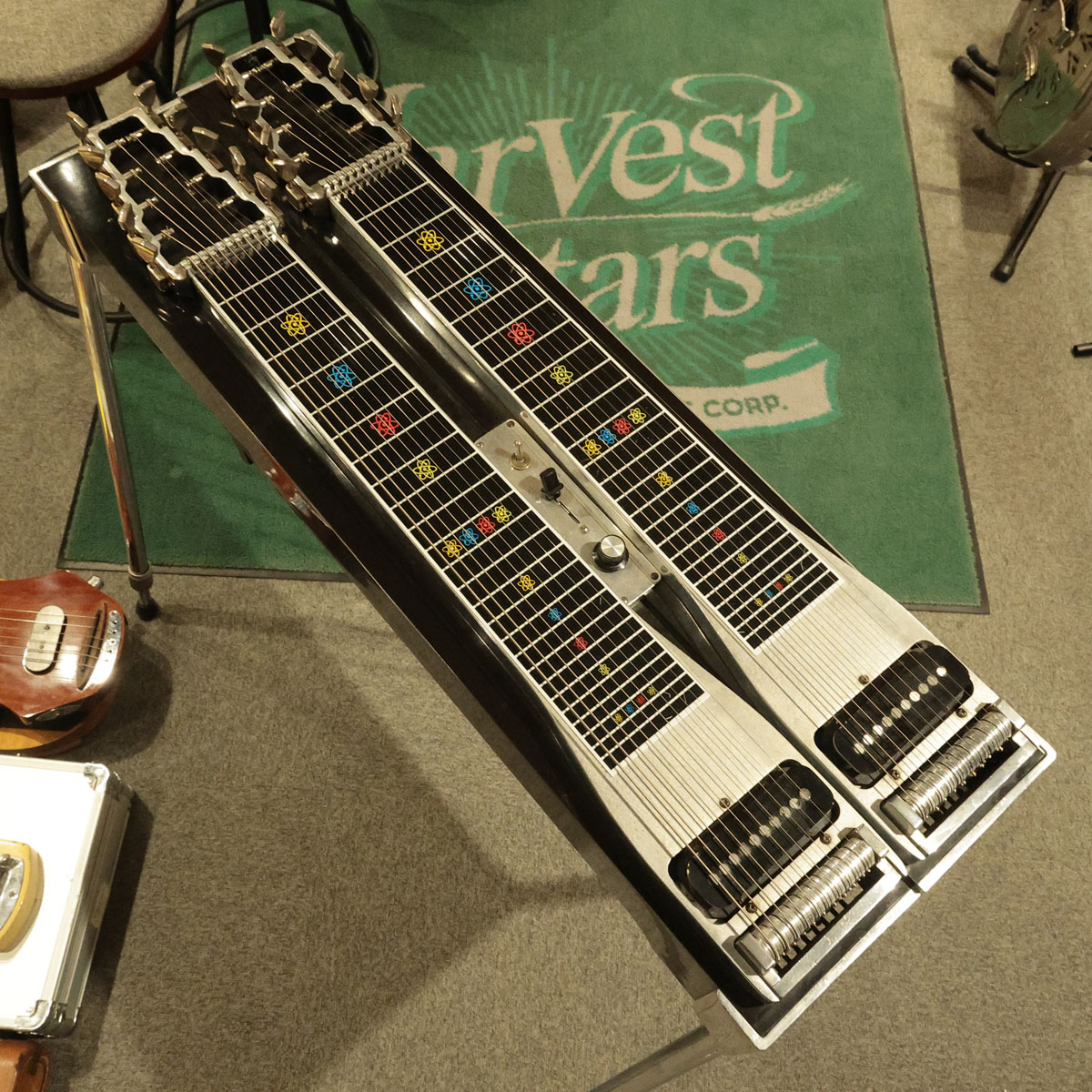 エモンズは今日のペダル・スティール・ギターの演奏スタイルを確立したバディ・エモンズが自ら設立したブランドです。バディがエモンズ以前にショット・ジャクソンと組んだショー・バッドと並ぶ、ペダル・スティールを代表するブランドです。両ブランドとも近年復活を遂げていますが、こちらはもはやヴィンテージと呼べる1979年製。プッシュ・プルのチェンジャー機構をフィーチャーしています。ブラック・マイカ仕上げで、10弦ダブル・ネック(E9thチューニング+C6thチューニング)、8フロア・ペダル、4ニー・レバーという標準的な装備です。