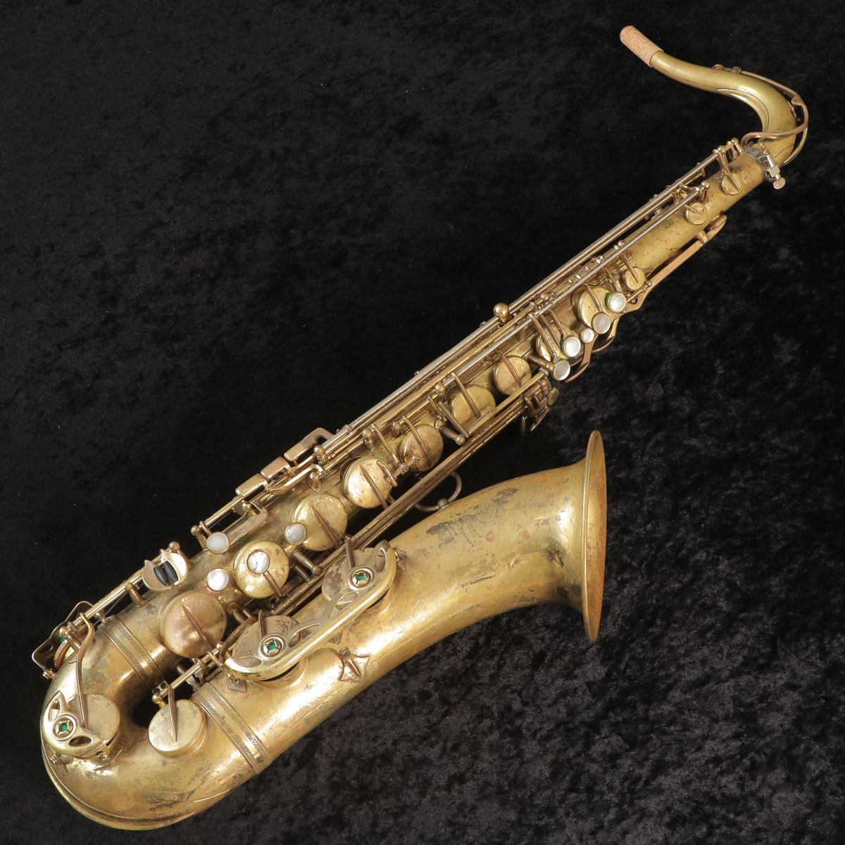 セルマーテナーサックスマークVIです。こちらはほぼラッカーが剥がれているコンディションで風格があります。一部キィガードのパーツ交換、ハンダ修正痕、ネックも含め全体的に凹み修正痕が見受かられますが演奏に問題ございません。乾いたジャジーなサウンドでジャズプレイヤーとの相性も良さそうです。よく吹き込まれた個体で即戦力になると思います。こちらは全タンポ交換調整済みです。