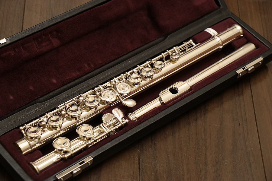 頭部管と管体パイプを銀製とすることで限りなく総銀製に近づけた、より豊かで温もりのある響きが魅力。音色の変化がつけやすく、多彩な表現が可能です。演奏者のデリケートな要求にもしっかりと応えてくれる411シリーズ。頭部管銀製、管体銀製、キィパーツは洋銀製・銀メッキ仕上げ。カバードキィ、C足部管、Eメカニズム装備。全体的に使用キズ、頭部管から管体にかけて凹み修正跡、細かな凹みが見られます。全タンポ交換を含む全体調整済み。