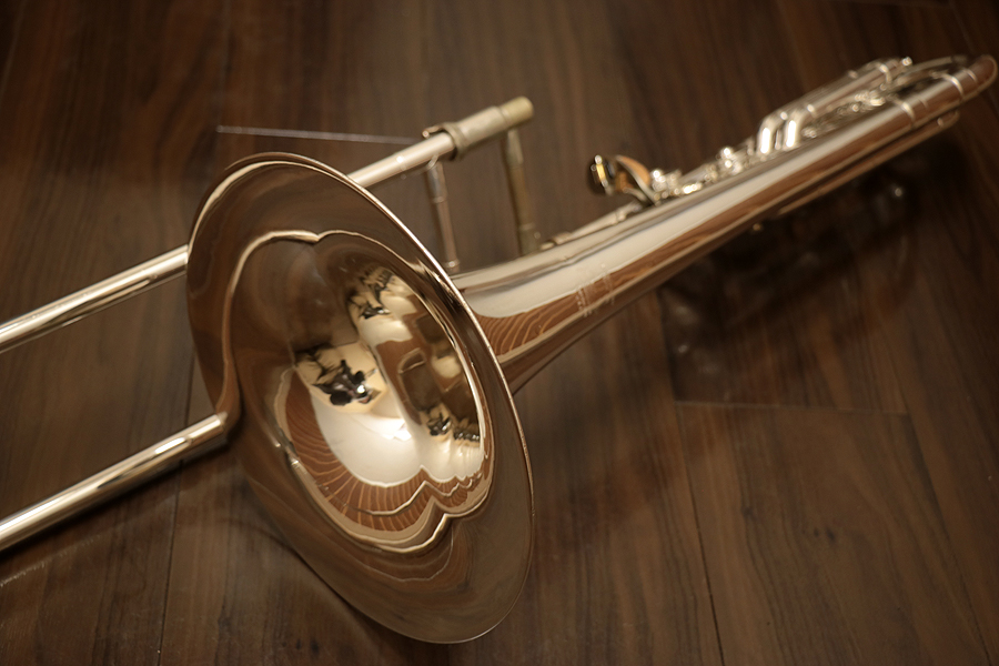 50BのF管に第2バルブを装着したオフセットタイプのダブルロータリーバストロンボーン。シリアルから1970年代後半に製造された個体と思われます。バルブセクション以外は50Bと同じで、第2バルブがF管の途中に付いています。その結果、第1バルブを押しているときに第2バルブを押すと、両方の管の長さを合わせたE♭管になるという仕組みです。インラインタイプのように第2バルブだけを単独で使うことはできませんが、第2バルブが主管を通っていないので、シングルロータリーの楽器のような吹奏感を得ることができます。 B♭/ F / E♭。イエローブラスベル、銀メッキ仕上げ。全体的によく使い込まれた印象のバストロンボーン。全体的に使用キズ、サビの発生が目立ちます。スライドグリップ部周辺にメッキ剥がれ使用感目立ちます。スライド内管外管に凹み修正跡、U字管に凹みが残ります。ベル管取り外し、再溶接跡がありベルフレアにかけて凹み歪み修正跡が目立ちます。刻印の残り具合からオリジナルの銀メッキと思われます。