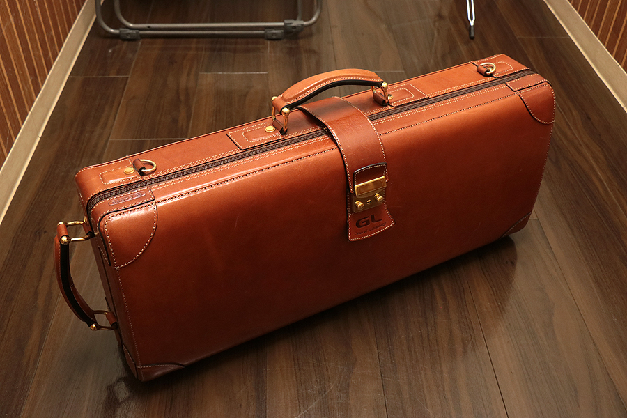 GLCASESの高級感あふれるオールレザー張りのアルトサックス用ケース。カラーはブラウン。日本国内での流通量はきわめて少なく、希少なケースです。全体的に使用キズ、レザーなりの変色が見られますが大きなダメージはございません。ストラップ込みで重量は約3.93kg。