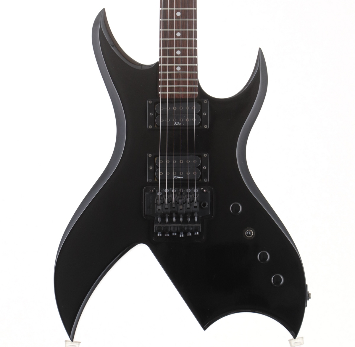 スルーネックを世に送り出し、MockingbirdやWarlockといった個性的なシェイプで特徴のB.C.リッチ。主力モデル「Bich」のロック式トレモロ仕様です(型番不明)。ヘキサポールピース仕様のオリジナルハムバッカーx2、アクティブサーキットを持たないリアVol/3Wayセレクター/フロントVol/Toneのシンプルなコントロールになっています。