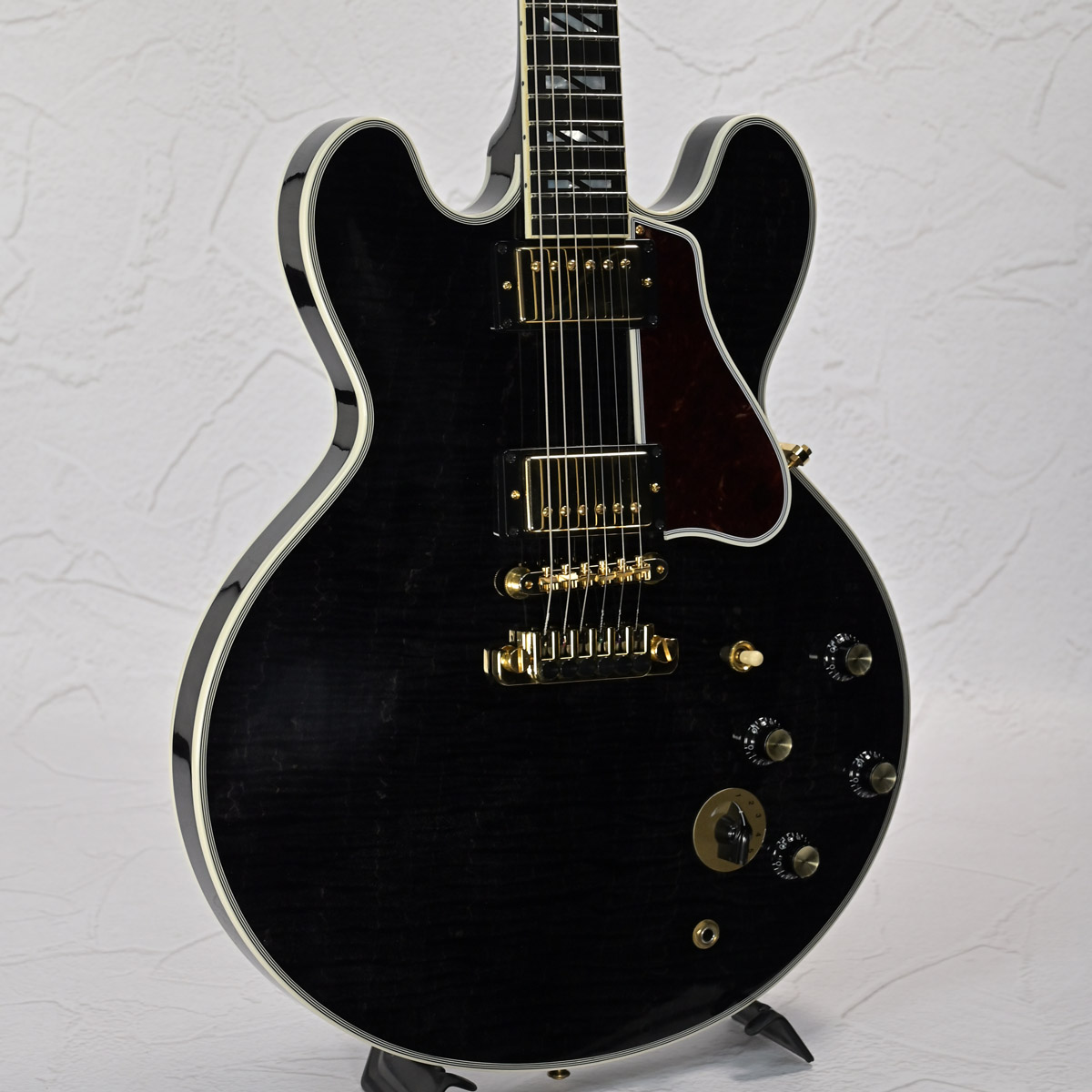 Fホールを持たないセミホロウボディには美しいフィギュアドメイプルを採用。スリムテーパー・プロファイルのマホガニーネック、スプリット・ブロック・マザー・オブ・パールインレイが施されているエボニー指板、通常のエボニーカラーではなくトランスペアレント・エボニー・フィニッシュを採用し、一際オーラを放つルックスに仕上がっております。電装系はモノラル・バリトーン・スイッチ、オーディオ・テーパーCTSポテンショメーター、ペーパーインオイル・バンブルビー・キャパシター、ギブソン・カスタムバッカー・ハムバッキング・ピックアップという組み合わせです。
