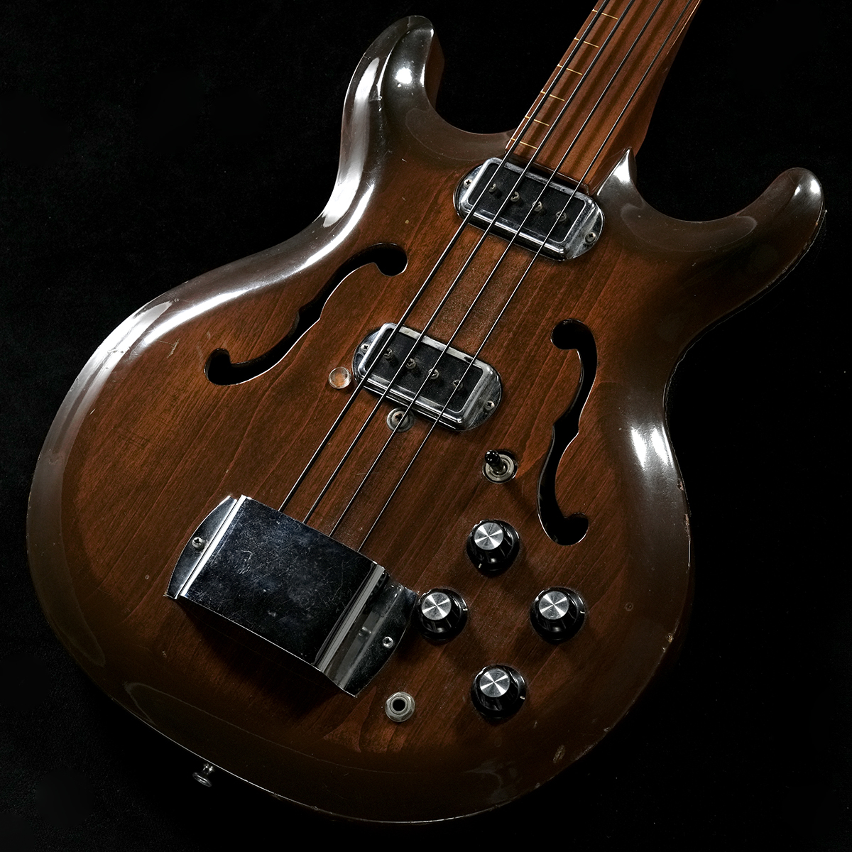 ナチュラルフィニッシュが多い中このブラウンサンバーストはレアカラーと言えるでしょう(このベース自体レアですが…)。生音としてはホロウボディというよりソリッドに近い印象、3弦までで止められたフレットラインは以外にも視認性に富み、ピッチも取りやすいのが特徴です。ポット類は交換されており、キャビティー内のアルミシートも後から貼られたものと思われます。現在ブラックナイロン弦が張られていますので、ピックアップマウンティングリングに触れて弾いていただければアースは落ちます。0