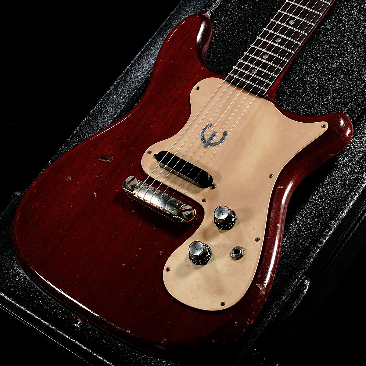 カラマズー工場で製造され、バットウイングヘッドが採用されていた時期のマホガニーボディ、シングルピックアップ仕様の本機。Olympicは、Cornetとボディが同様で、パーツの仕様が違うだけで呼び名が違う、何とも珍しいモデルであります。