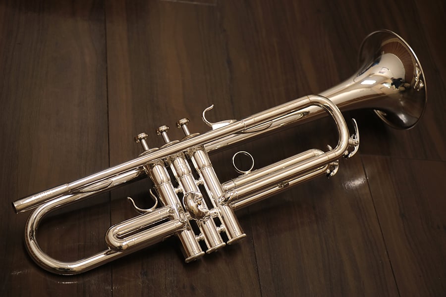 1970年代後半から1980年代前半まで製造されていた当時のプロモデル。銀メッキ仕上げ、MLボア、主管支柱なし、リバースチューニングスライドの採用といった設計で、軽快な吹奏感とコントロール性の良さを両立させたモデルです。全体的使用キズ。ベルフレアからベル管根本にかけて凹み修正後、細かな凹みが目立ちます。各抜差管に凹み修正跡。マウスパイプに凹み修正跡、メッキ剥がれ、凹みが残ります。