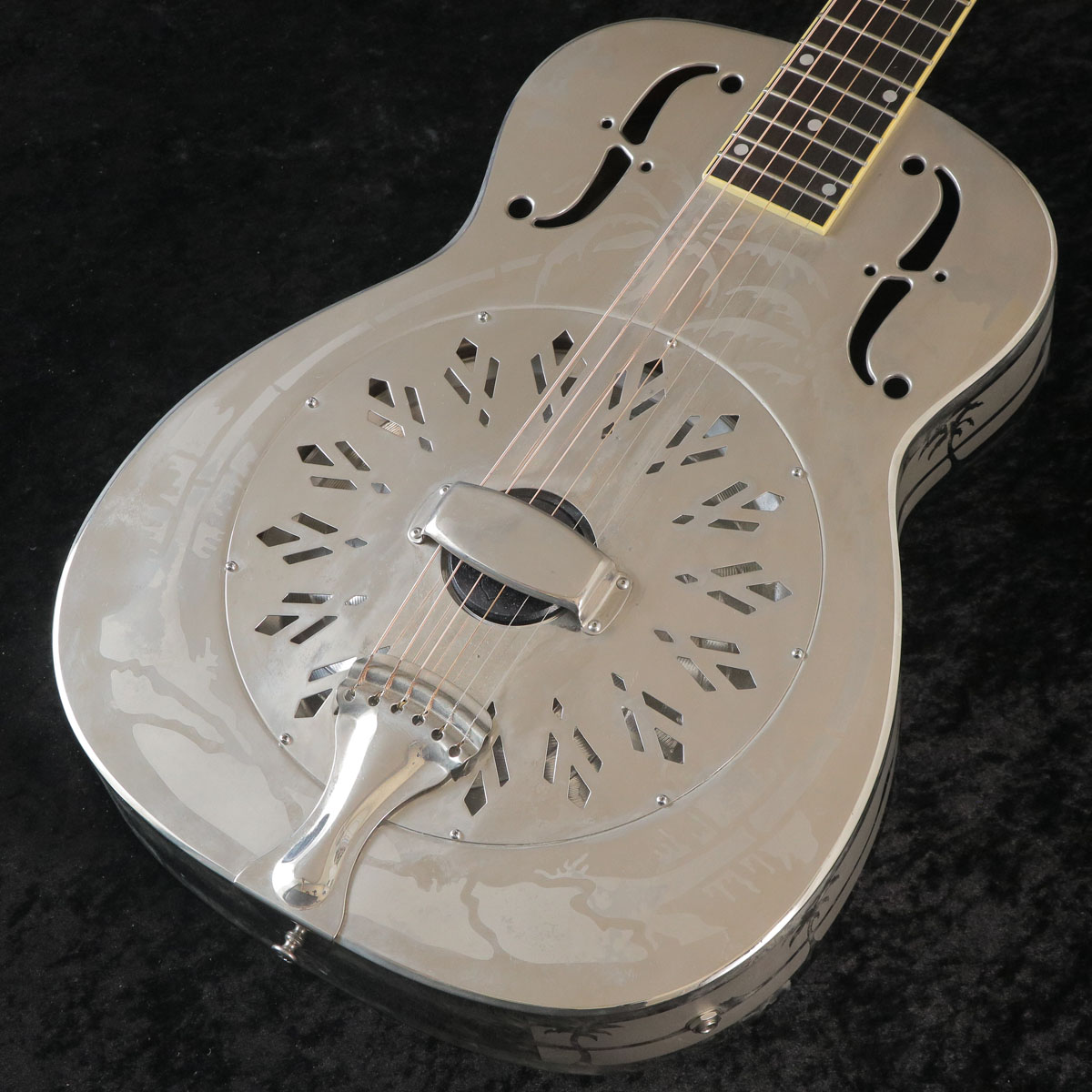 14フレット仕様のシングル・コーン・モデル、スタイル0の復刻版です。スタイル0は1930年から1943年まで生産されましたが、14フレット・ジョイントとなったのは1934年でした。ハワイの情景のエッチング入りのニッケル・メッキのブラス・ボディ、ビスケット・コーンをフィーチャーしています。