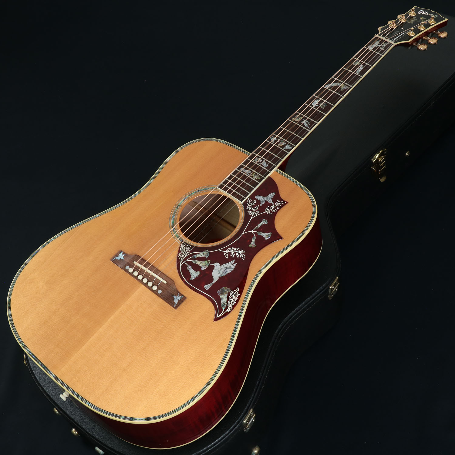 ギブソンのリミテッドエディション・ハミングバード・カスタム、2016年製です。アンティーク・ナチュラルのスプルース・トップ、ハンドラッブド・チェリーカラー仕上げのAAAフレイムメイプル・サイド&バック、フレイムメイプル・ネック、ローズ指板、ヘッド・指板・ブリッジにはハミングバード・インレイが施され、美しいハンド・エングレイブ装飾のグローバー・ペグが特徴的です。