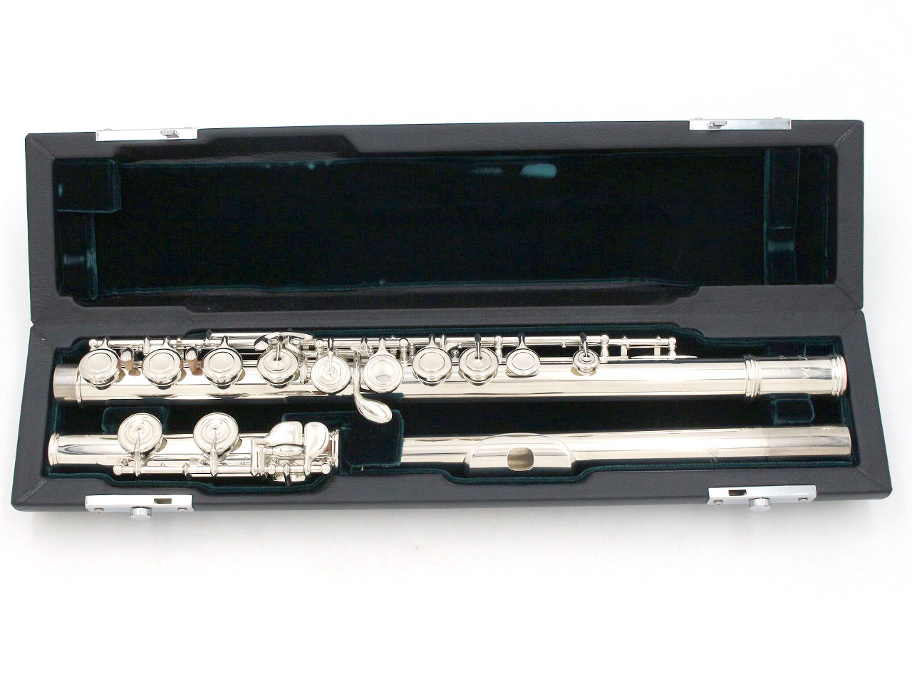 リッププレート銀製(Ag925 スターリングシルバー)、その他白銅、銀メッキ仕上げ、ポイントアームkey、Eメカニズム付、C足部管のモデル。