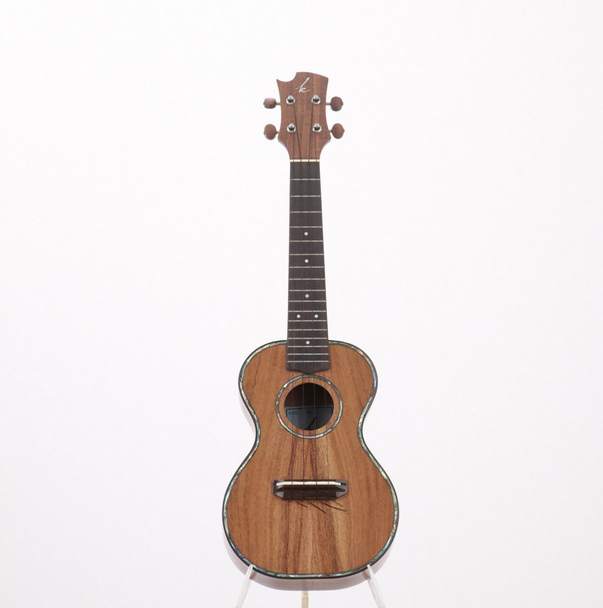 k ukuleleのK-301、アカシア・コア単板ボディ、14フレット・ジョイントの17フレット仕様、ギアペグ採用でペグボタンもアカシア・コア製、ボディ外周/サインドホールにはアバロン・インレイが施されています。