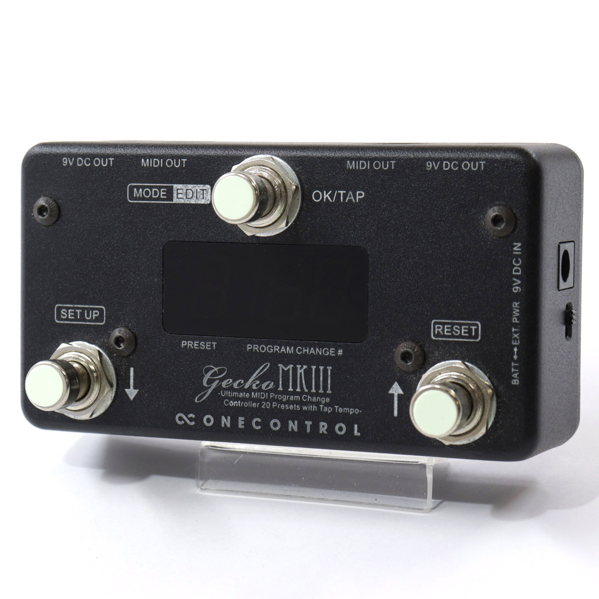 One Control Gecko MkIIIは、一般的なコンパクトエフェクターサイズで複数のMIDIプログラムチェンジメッセージとコントロールチェンジシグナルを用いたタップテンポを送信することのできるプログラマブルMIDIコントローラーです。
