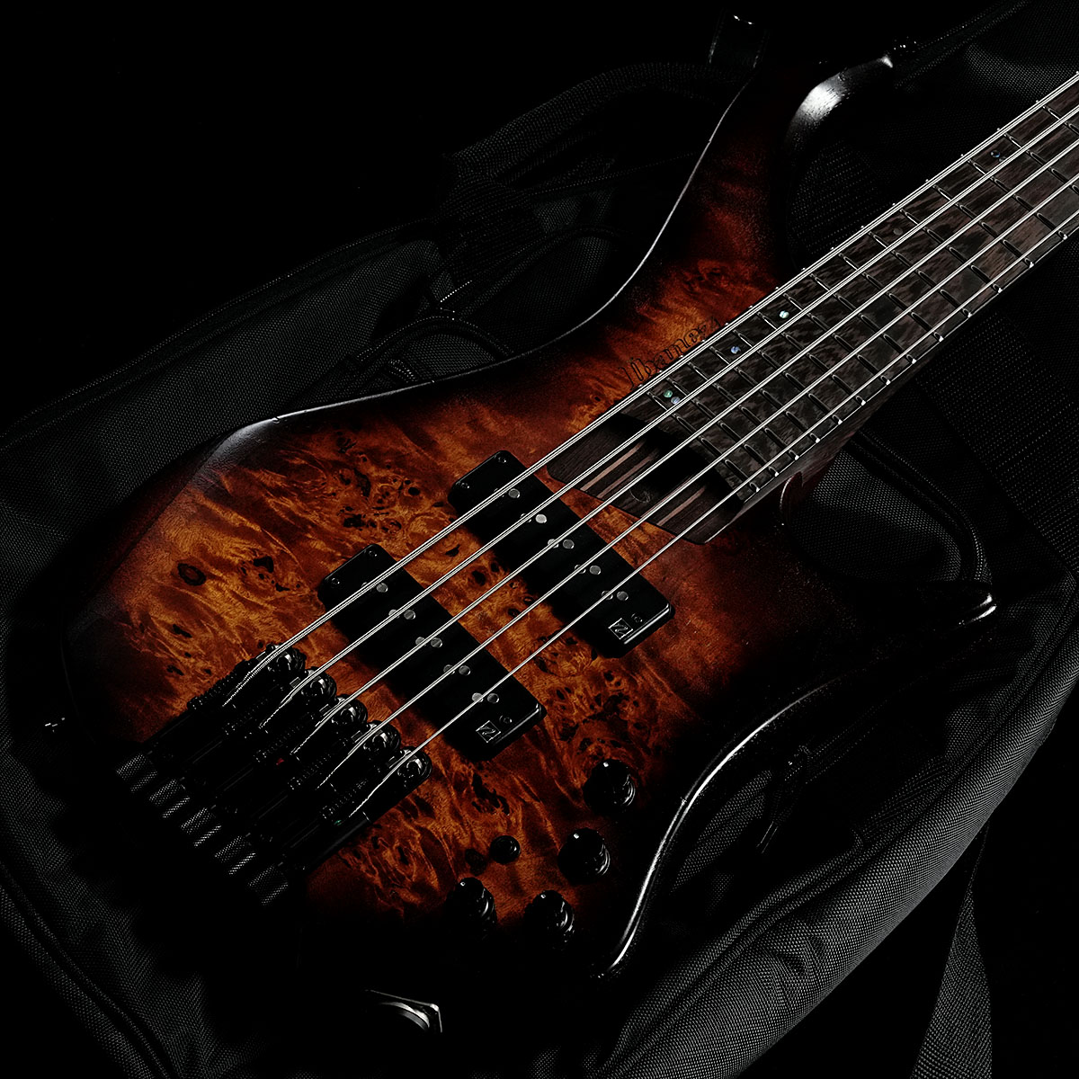 リビングやデスク・サイドにぴったりな杢目TOPのEHBショート・スケール5弦モデル