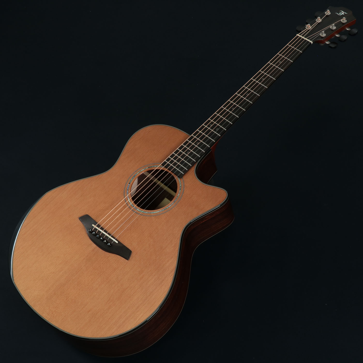 グランドオーディトリアムながらもフィット感をさらに高めたエルボー&バックコンターにカッタウェイ・シェイプ、シダートップの憂いあるトーンが魅力の一本です。