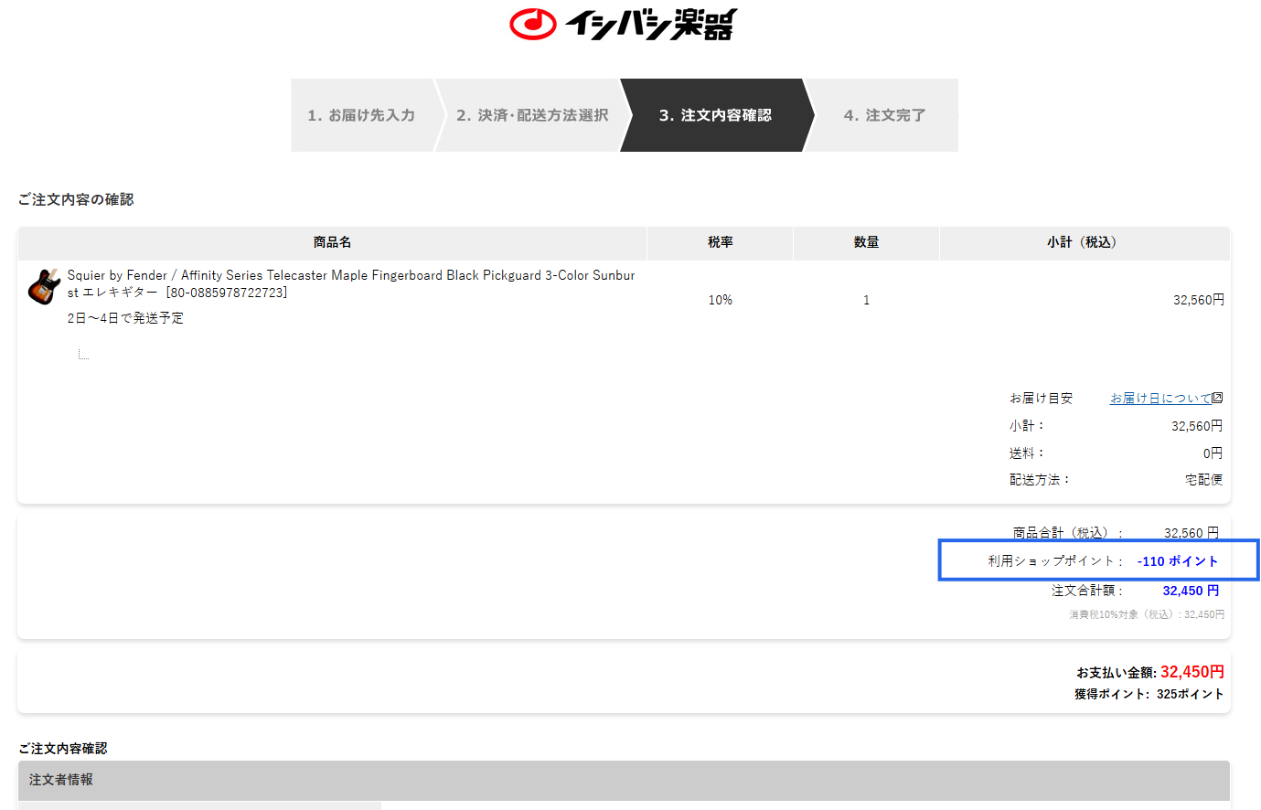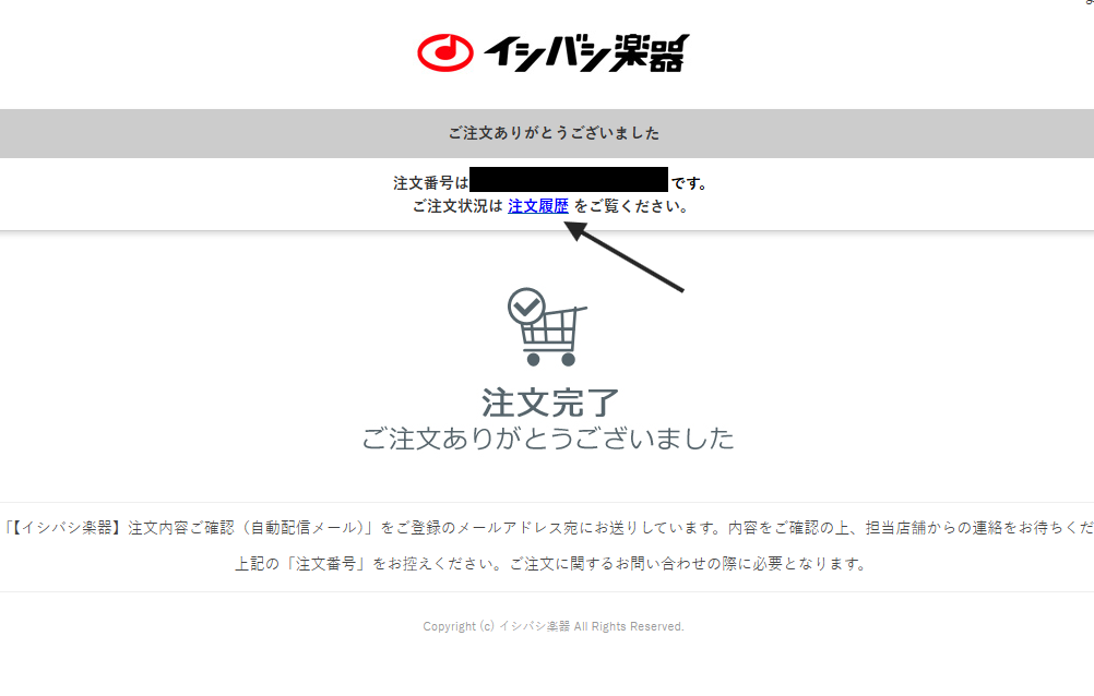 ご注文完了後、件名『【イシバシ楽器】注文内容ご確認(自動配信メール)』という自動配信メールがご登録のメールアドレスに送信されます。