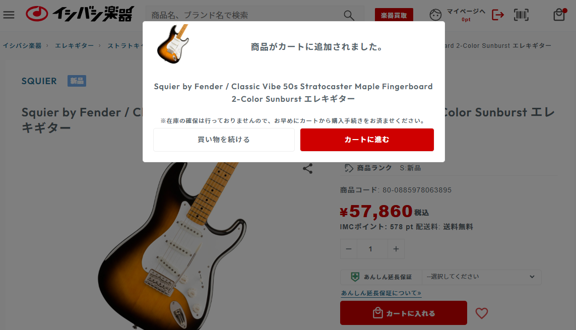続けて買い物をされる場合は『買い物を続ける』ボタンをクリックして下さい。商品画面に戻りますので、そこからお買い物を続けることができます。※カートボタンはページ右上にございますのでこちらからカート内をご確認頂けます。