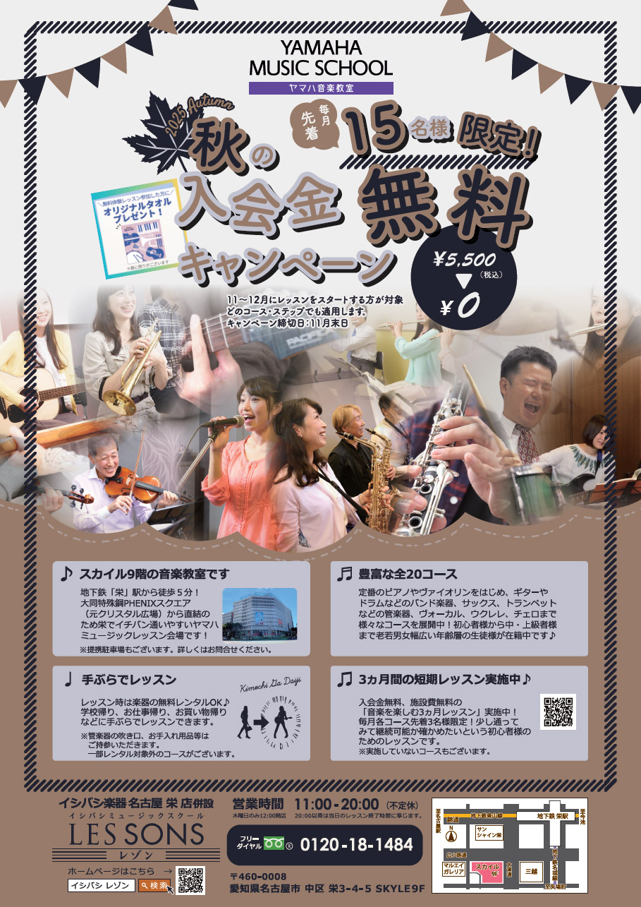 このレッスンでは入会金¥5500(税込)が無料!さらに施設費¥1650(税込)/月も無料で気軽にレッスンをスタートすることができます!