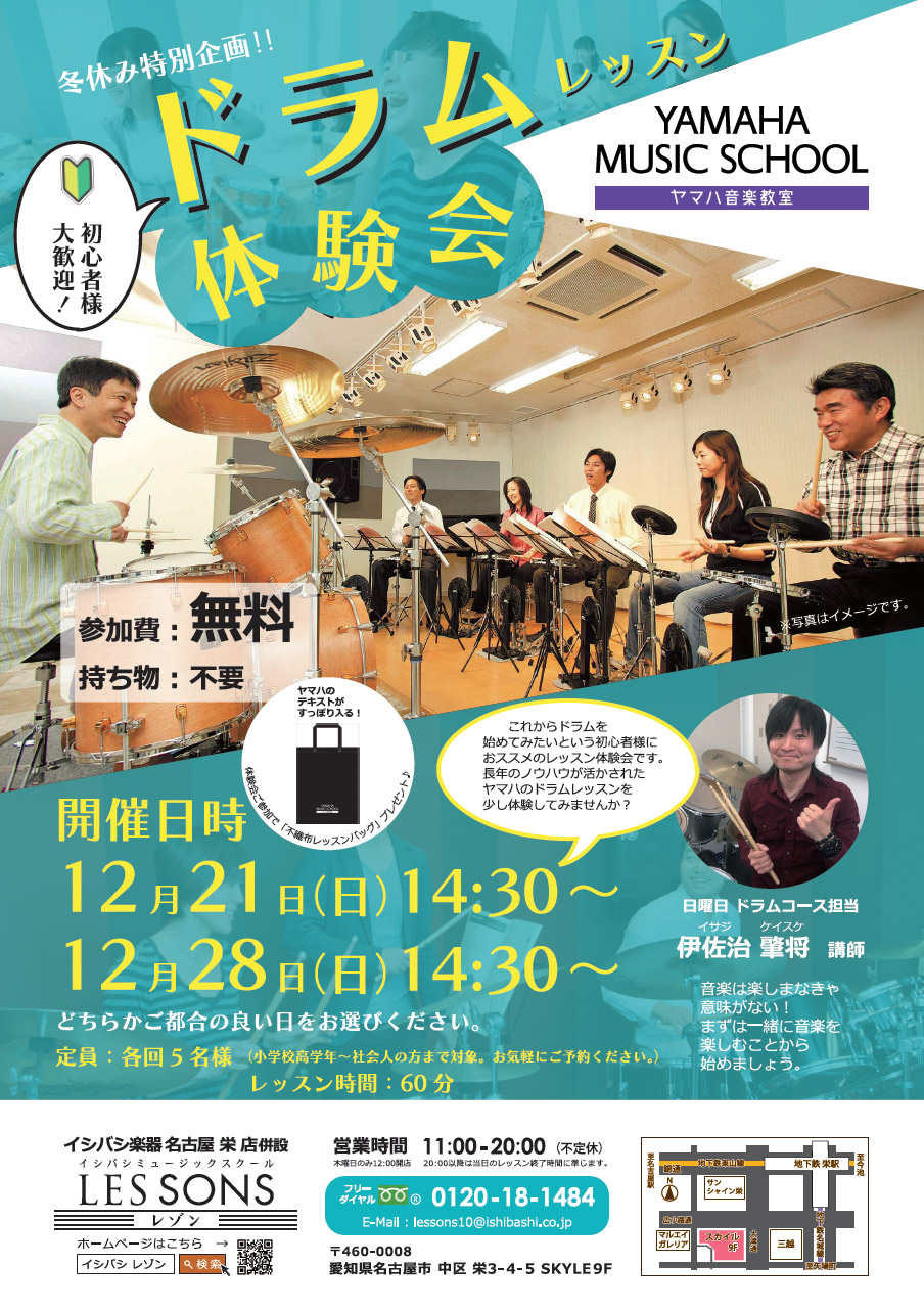 (テキスト、管楽器の吹き口部分、お手入れ用品、ドラムスティックなどの消耗品はお持ちいただきます)