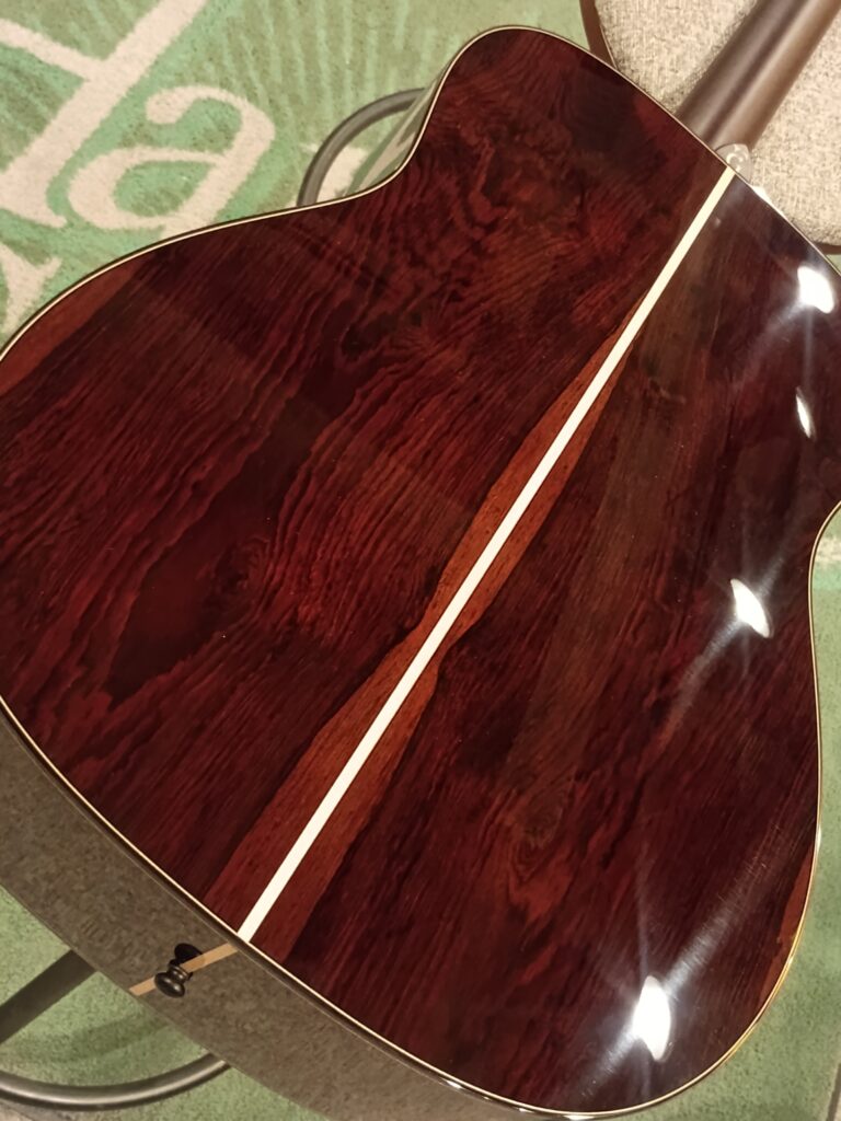 グアテマラ・ローズウッドとアディロンダック・スプルースの組み合わせで、芯のある倍音が特徴です。更に素晴らしい特徴的な木目は見ているだけでもインスピレーションが湧いて来ます。