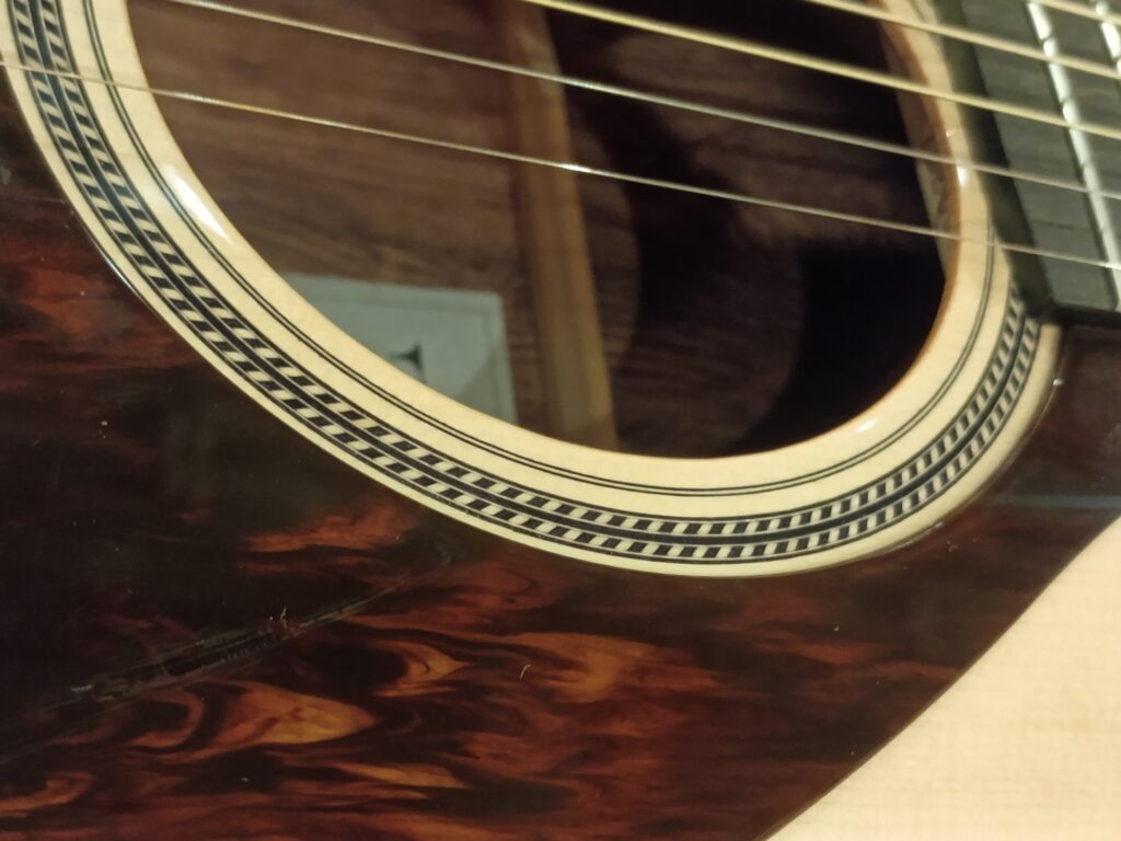 FG9の独特のデザインも素晴らしく際立っています。サウンドホールの装飾は日本の「しめ縄」をモチーフにデザインされています。木材の組み合わせで表現された繊細な職人技と言えるでしょう。素材感が際立つ日本的な美術表現となっています。