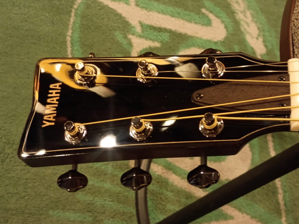 ペグにはゴトーのブラック・クロームのオープンギアペグが採用されています。ヘッド裏にはこのギターが特別なモデルであることを示す「Yamaha Guitars 60th Anniversary」の金色の文字がきらりと光ります。