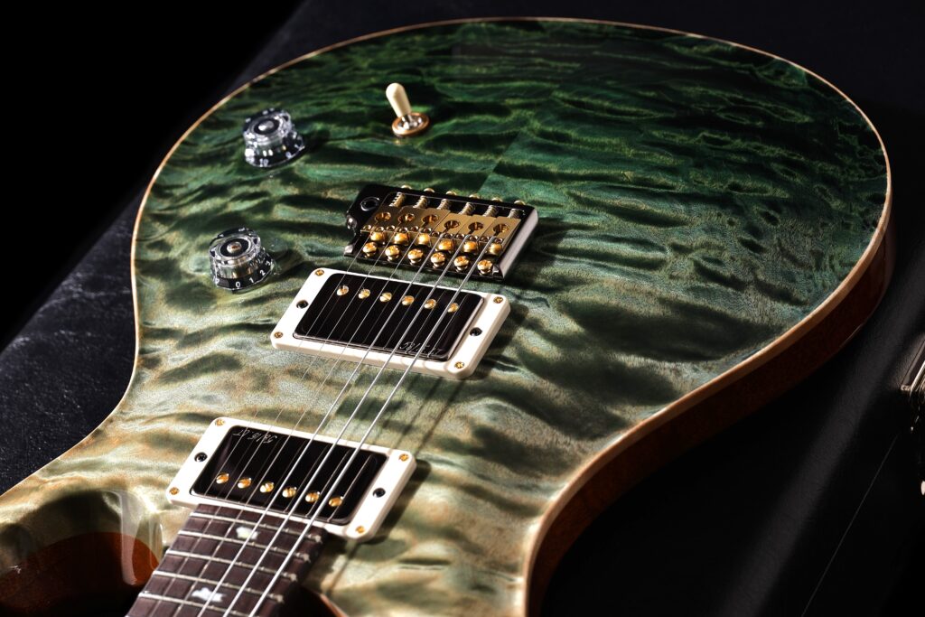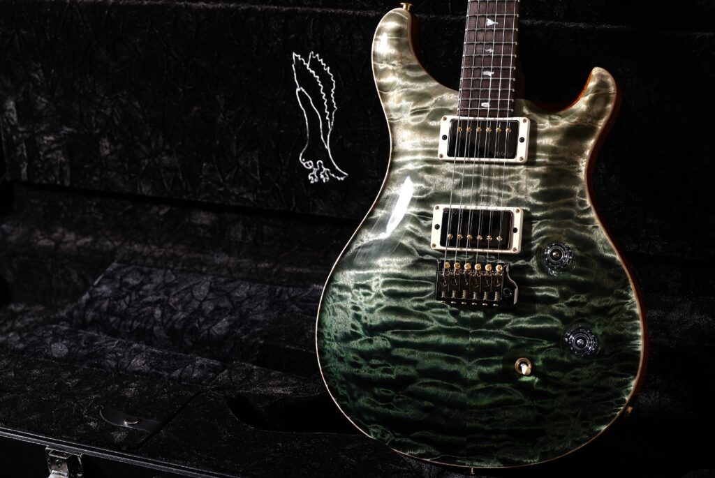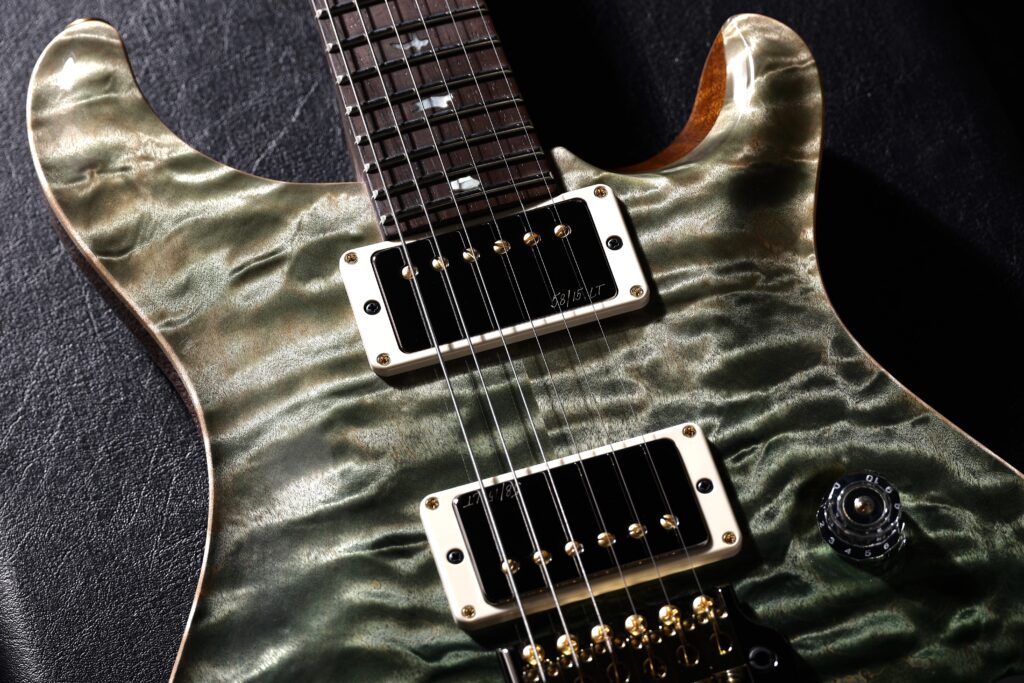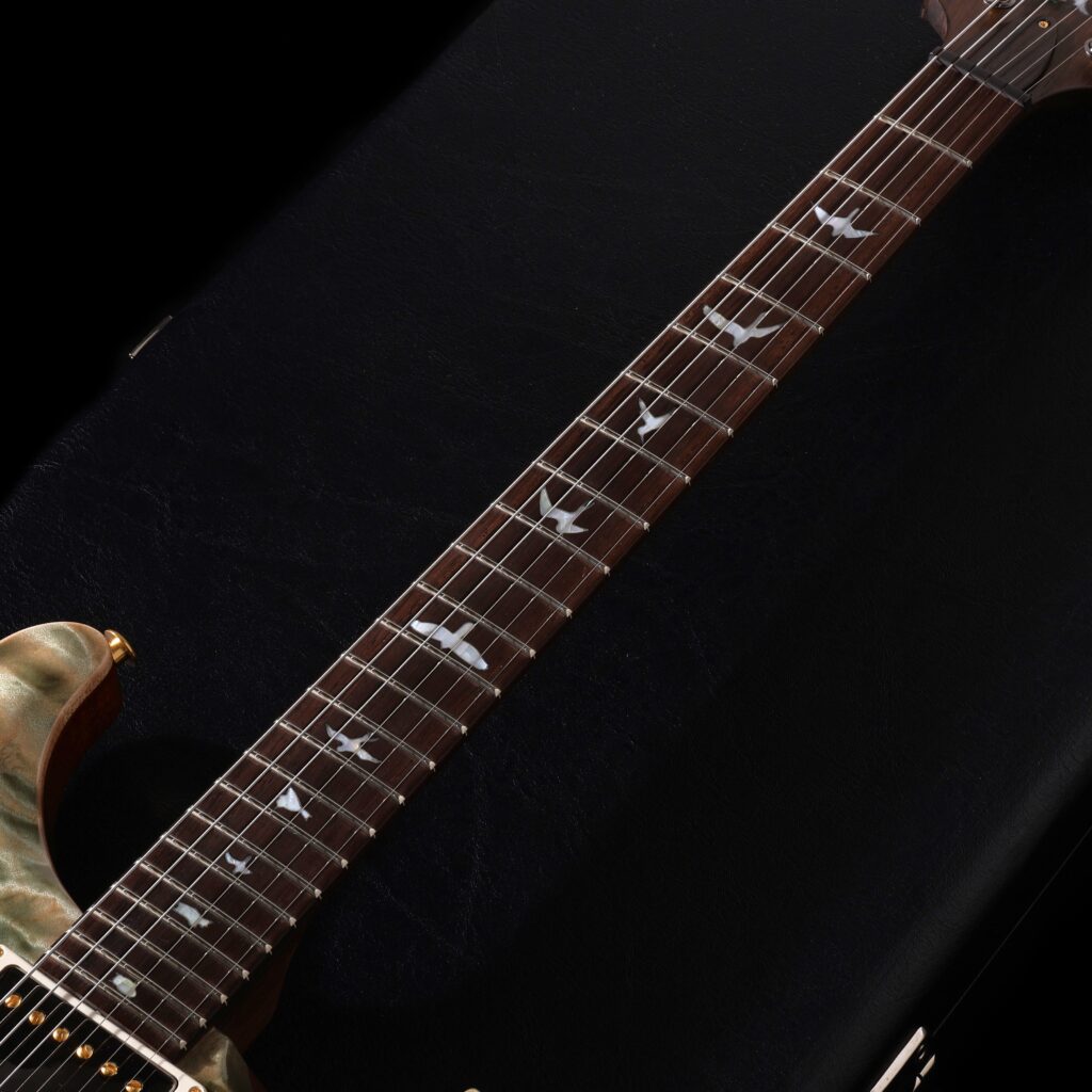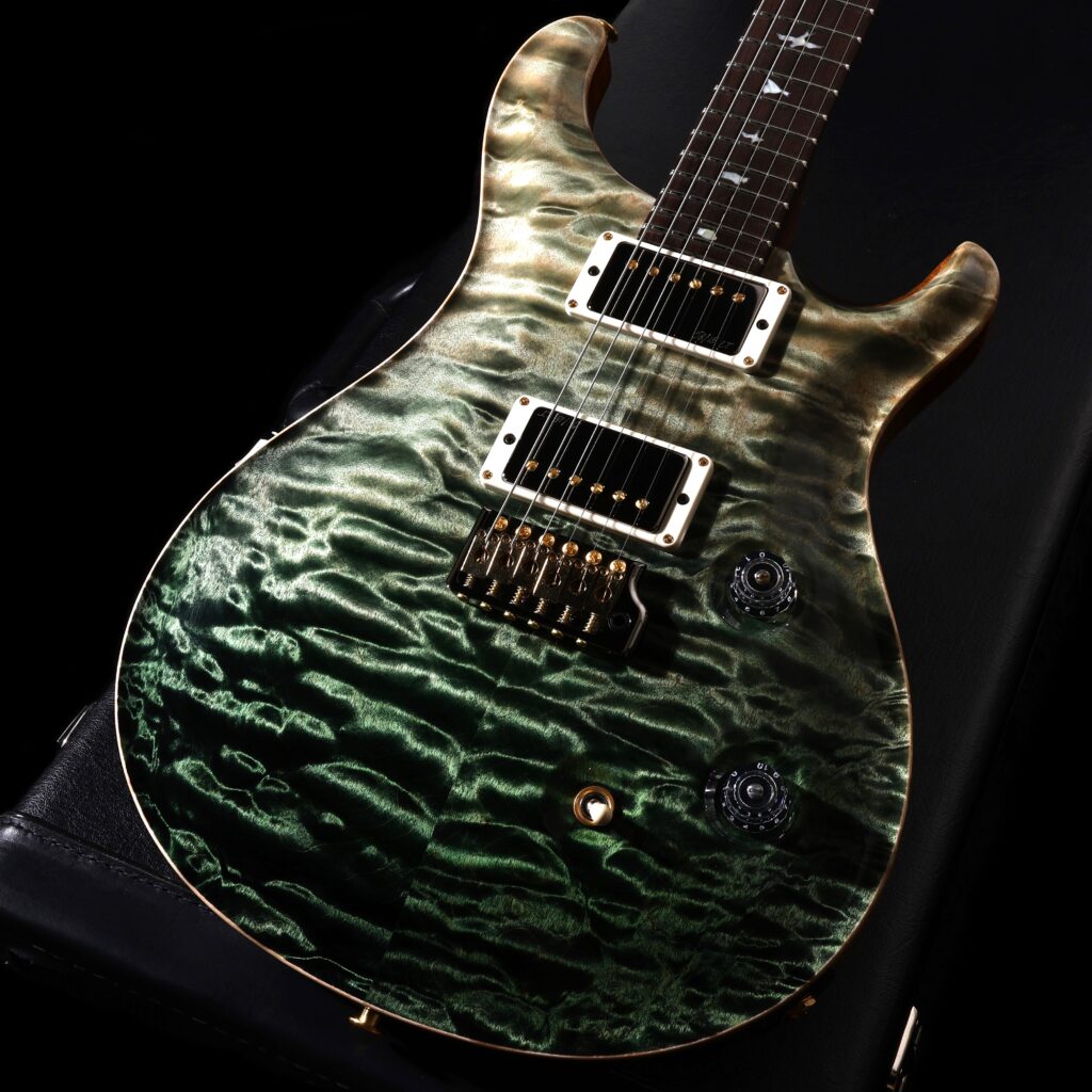 カラーリングは、ボディ下部に向かって深みを増していく“Sage Fade”。その美しいグラデーションを引き立てるのが、PRSが誇るハイグロス・ニトロ(ラッカー)フィニッシュで、ギター全体に柔らかな光沢と奥行きが生まれています。熟練の塗装技術があってこその完成度で、まさに“一級品”と呼ぶにふさわしい仕上がりです。