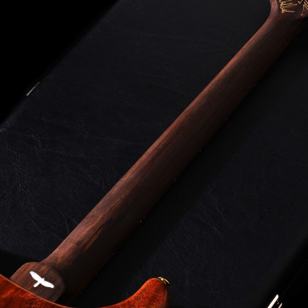 ネックと指板には、近年ますます入手が難しくなっている「ブラジリアン・ローズウッド(ハカランダ)」を採用しています。独特の深い色味と芳醇な響きは、他の材では代えがたい魅力があり、一本のギターとしての価値を大きく高めています。