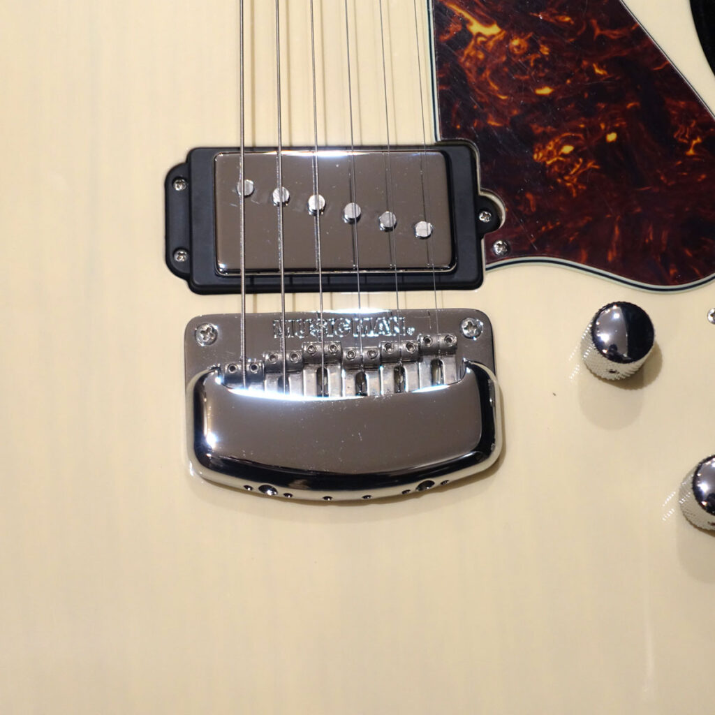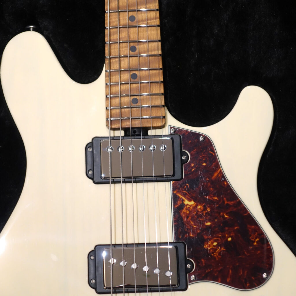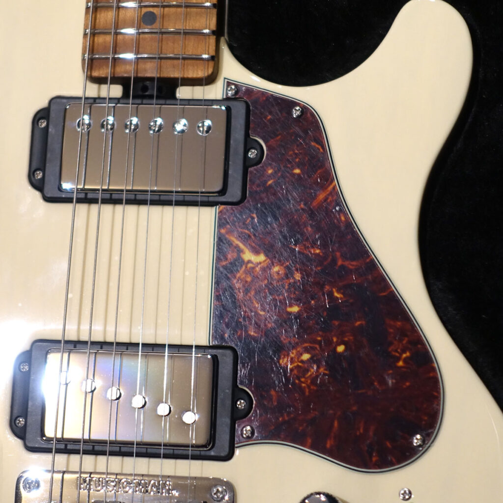 ピックアップは2ハム仕様に見えますが、リアピックアップはハムサイズのシングルコイルピックアップとなります。