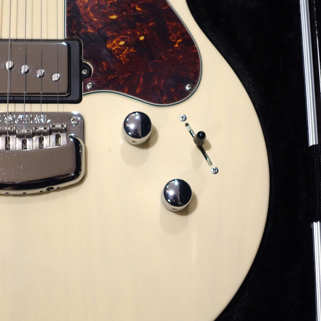 コントロールツマミはどちらもプッシュ/プッシュスイッチ仕様になっており、ボリュームはゲイン・ブースト・スイッチ、トーンはフロント・ハムバッカーのコイルタップ・スイッチとなっております。