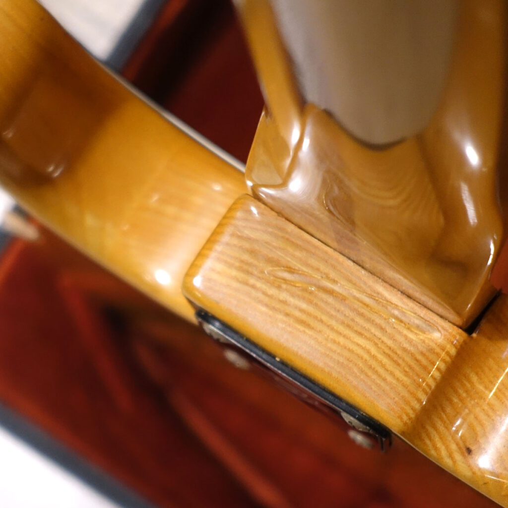 こちらは1フレット付近の塗装剥がれ。露出した木部に黒ずみが見られます。